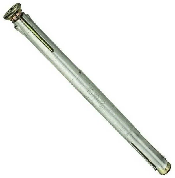 Дюбель металлический для газобетона имеет фигурные продольные ребра и клиновидные сегменты, благодаря которым надежно удерживает крепеж в пористом материале.