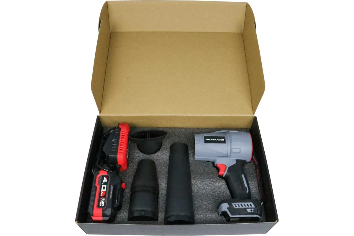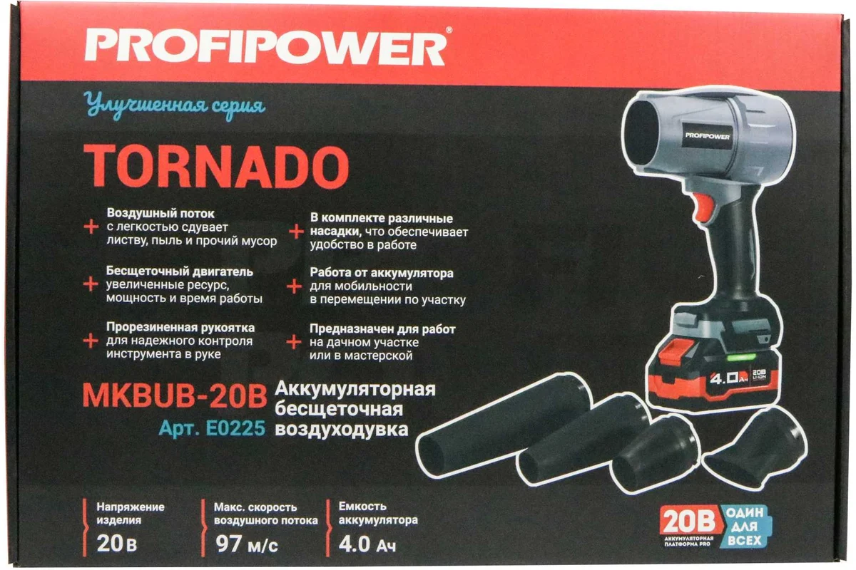Аккумуляторная бесщеточная воздуходувка PROFIPOWER "Tornado" MKBUB-20В (20В, Li-ion-1шт, 4.0Ач, З/У, с насадками, в коробке)