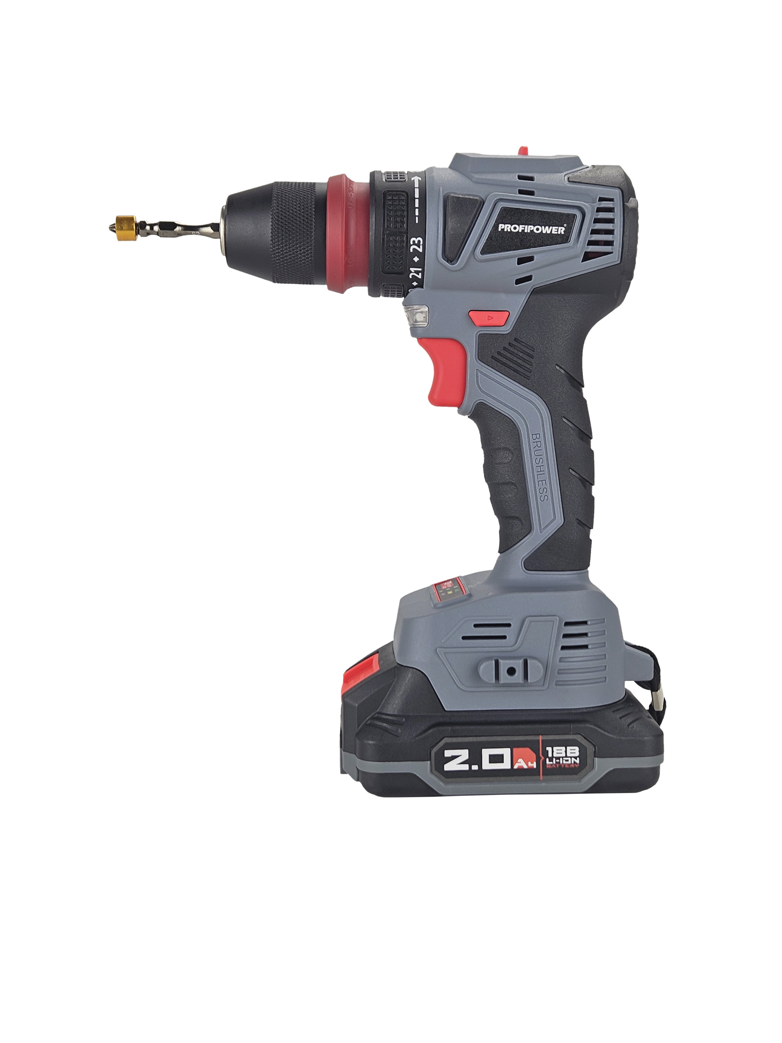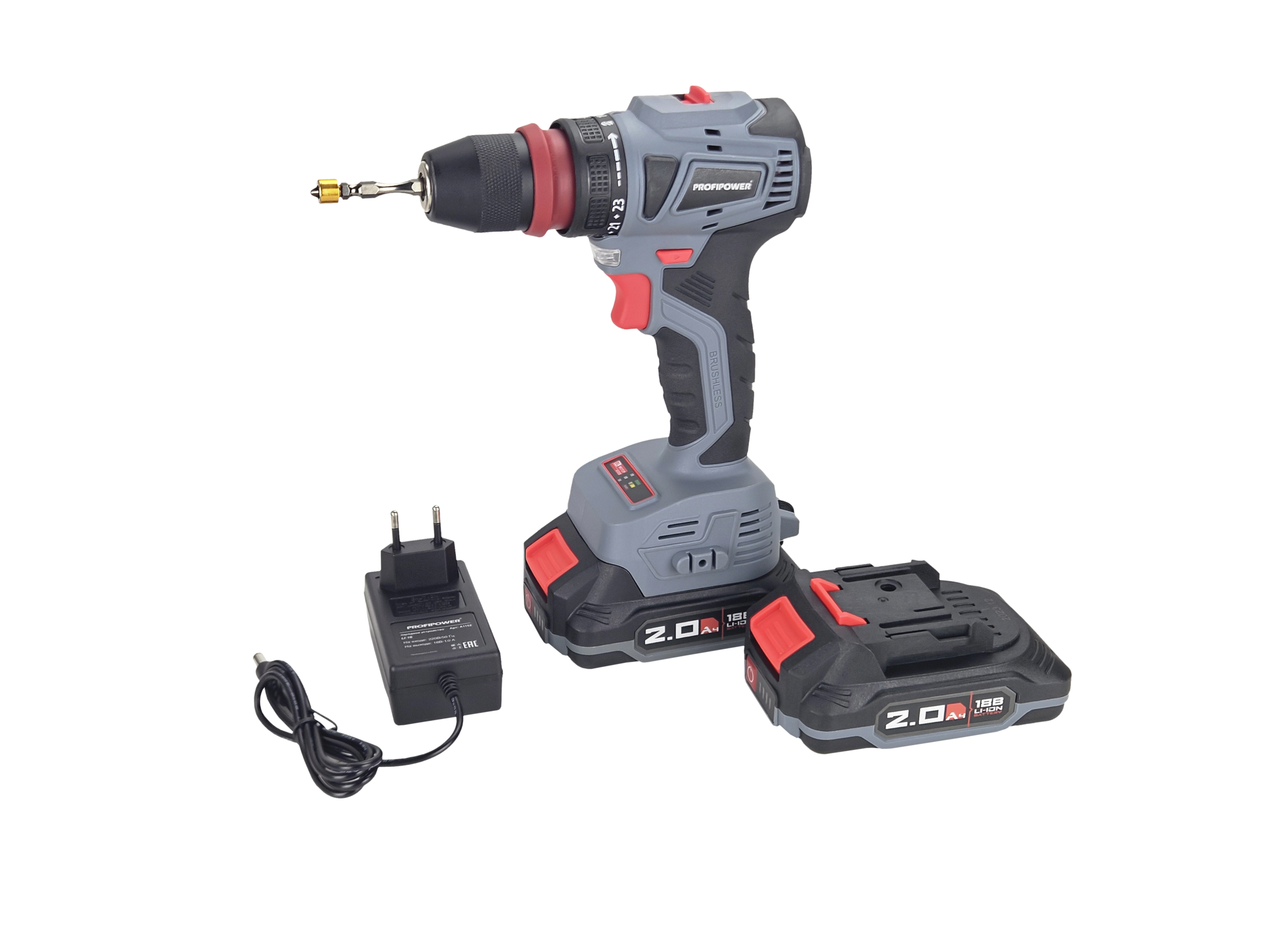 Дрель-шуруповерт PROFIPOWER MKBL18B (T0056) [18В, 2х2.0 Ач, бесщеточный, кейс] предназначена для ремонтных и строительных работ, сверления древесины, металлов, керамики и синтетических материалов, для завинчивания или откручивания винтов, нарезания резьбы в трех режимах: сверление, сверление с ударом, завинчивание. - Инструмент предназначен для работы в условиях умеренного климата с диапазоном температур от -10 до + 35 °С и относительной влажности не более 80%, с отсутствием прямого воздействия атмосферных осадков и чрезмерной запыленности воздуха. - Полимерный корпус изделия обеспечивает защиту инструмента от твердых частиц размером более 12 мм, но не защищает от воды. - Универсальная модель с бесщеточным двигателем для решения любых задач сверления и закручивания. - Защита от перегрузок. - Li-Ion аккумулятор с собственной BMA-system (поддержание постоянной мощности) и функцией быстрой зарядки для комфорта в работе. - Плавный пуск и электронный тормоз мгновенной остановки патрона для качественной работы. - Яркая светодиодная подсветка рабочей области для удобства выполнения операций. - Многоступенчатая регулировка усилия закручивания для аккуратного обращения. - Эргономичная нескользящая рукоятка для надежного контроля инструмента. - Информативный индикатор заряда для уверенной эксплуатации.