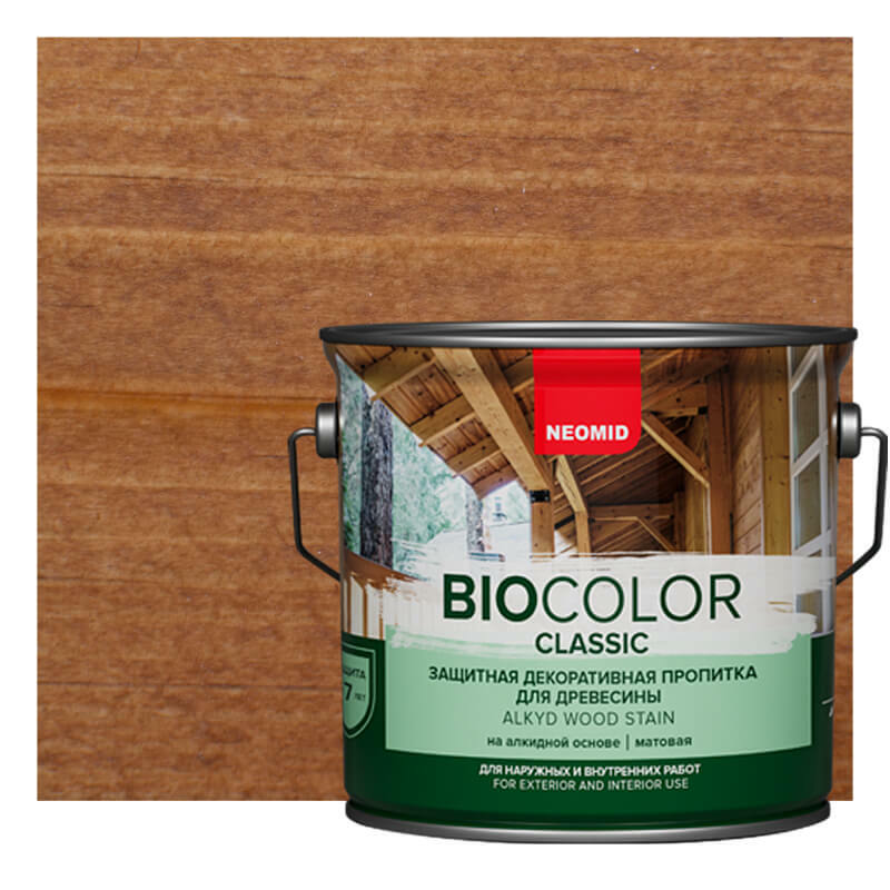 NEOMID Bio Color Classic  деревозащитный декоративный глубокопроникающий состав на алкидной основе для эффективной защиты и декоративной отделки деревянных поверхностей. Обладает хорошей пропитывающей способностью и образует на поверхности полуматовую защитную пленку с высокими декоративными и защитными свойствами. Благодаря входящим в состав активным добавкам образующееся покрытие имеет трехступенчатую систему защиты деревянной поверхности.