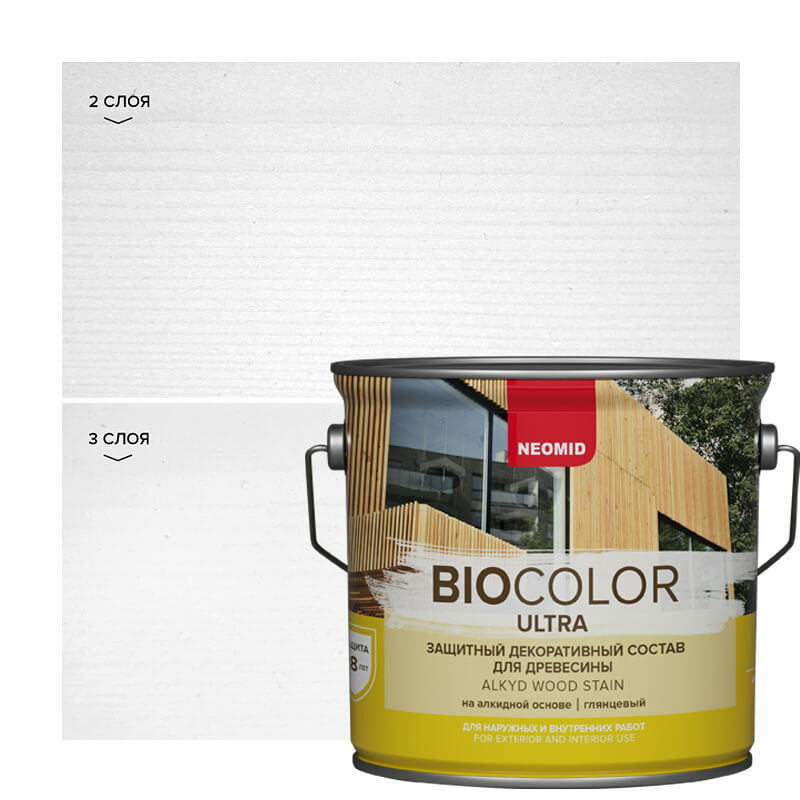 NEOMID Bio Color Ultra  Высокоэффективный деревозащитный декоративный состав на алкидной основе для защиты и декоративной отделки деревянных поверхностей. Образует на поверхности глянцевую усиленную лаковую защитную пленку с высокими декоративными и защитными свойствами.