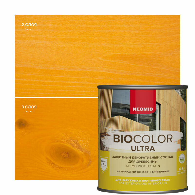 NEOMID Bio Color Ultra  Высокоэффективный деревозащитный декоративный состав на алкидной основе для защиты и декоративной отделки деревянных поверхностей. Образует на поверхности глянцевую усиленную лаковую защитную пленку с высокими декоративными и защитными свойствами.