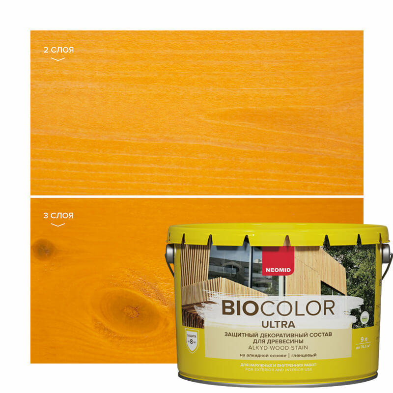 NEOMID Bio Color Ultra  Высокоэффективный деревозащитный декоративный состав на алкидной основе для защиты и декоративной отделки деревянных поверхностей. Образует на поверхности глянцевую усиленную лаковую защитную пленку с высокими декоративными и защитными свойствами.