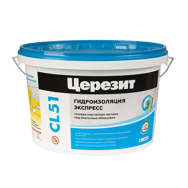 Гидроизоляция эластичная полимерная Церезит CL 51 1.4 кг 207357 2564895 - однокомпонентный состав, полностью готовый к применению. Наносится под плиточную облицовку на стены и полы в помещениях с высокой влажностью (ванны, душевые, туалеты, кухни).