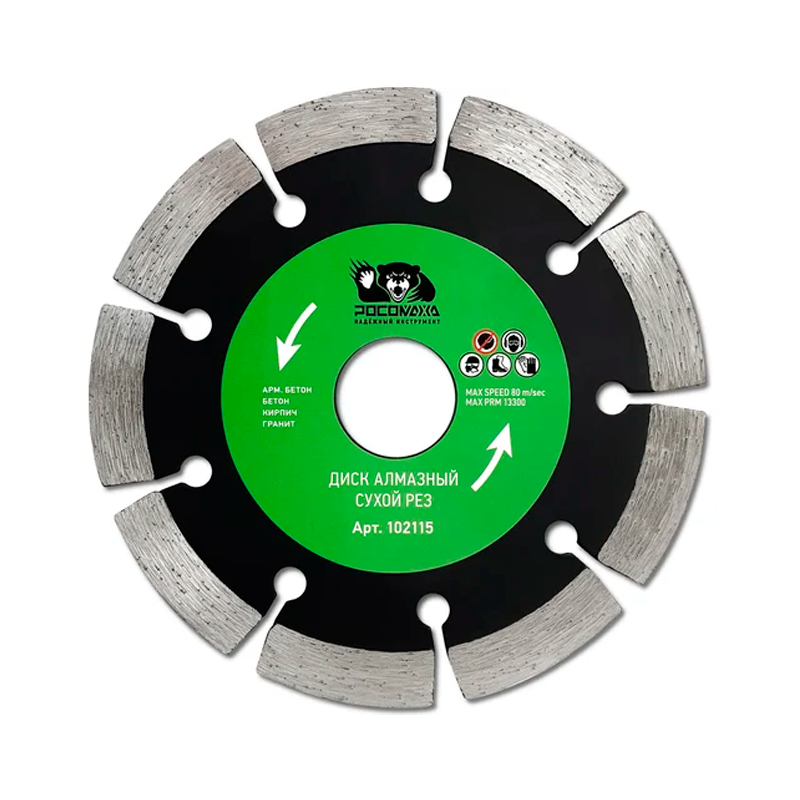 Диск отрезной алмазный сегментный Росомаха 102125 предназначен для угловых шлифовальных машин. Применяется для сухого реза бетона, армированного бетона и камня. Благодаря сегментной структуре диск легко удаляет шлам и хорошо охлаждается, за счет чего обеспечивается максимальный ресурс при работе.