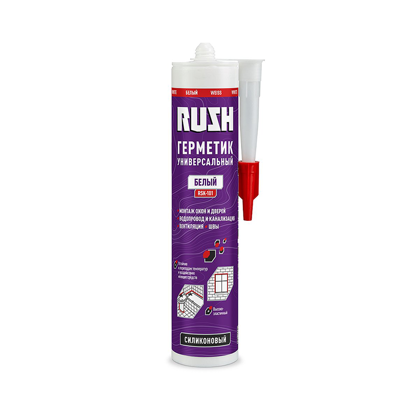 Высококачественный универсальный силиконовый герметик RUSH® с системой отверждения ацетокси применяется в общих бытовых, ремонтных и строительных работах.