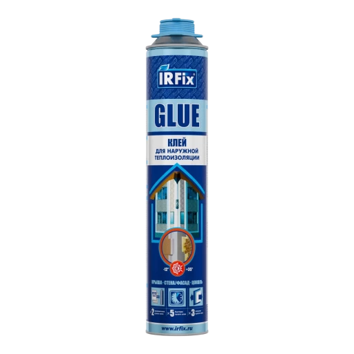 Высококачественный однокомпонентный полиуретановый клей-пена IRFix GLUE для наружной теплоизоляции используется для монтажа ЕРS и ХРS плит на различные строительные основания. Не требует предварительного замешивания.