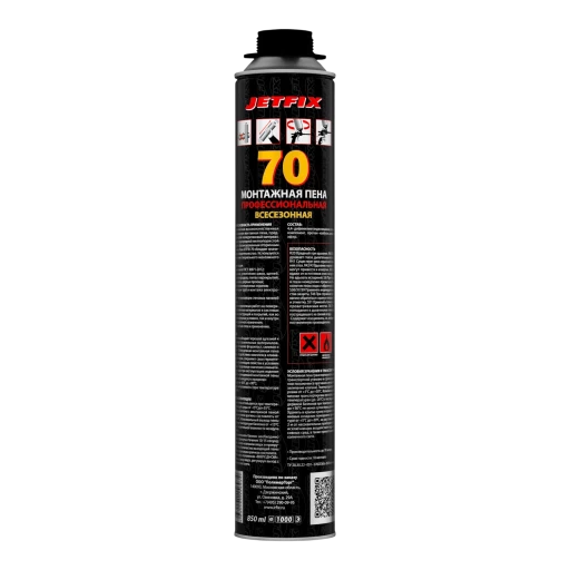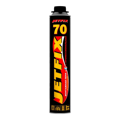 Высококачественная однокомпонентная полиуретановая монтажная пена всесезонного применения JETFIX 70 в аэрозольной упаковке 850мл. Используется с применением специального монтажного пистолета.