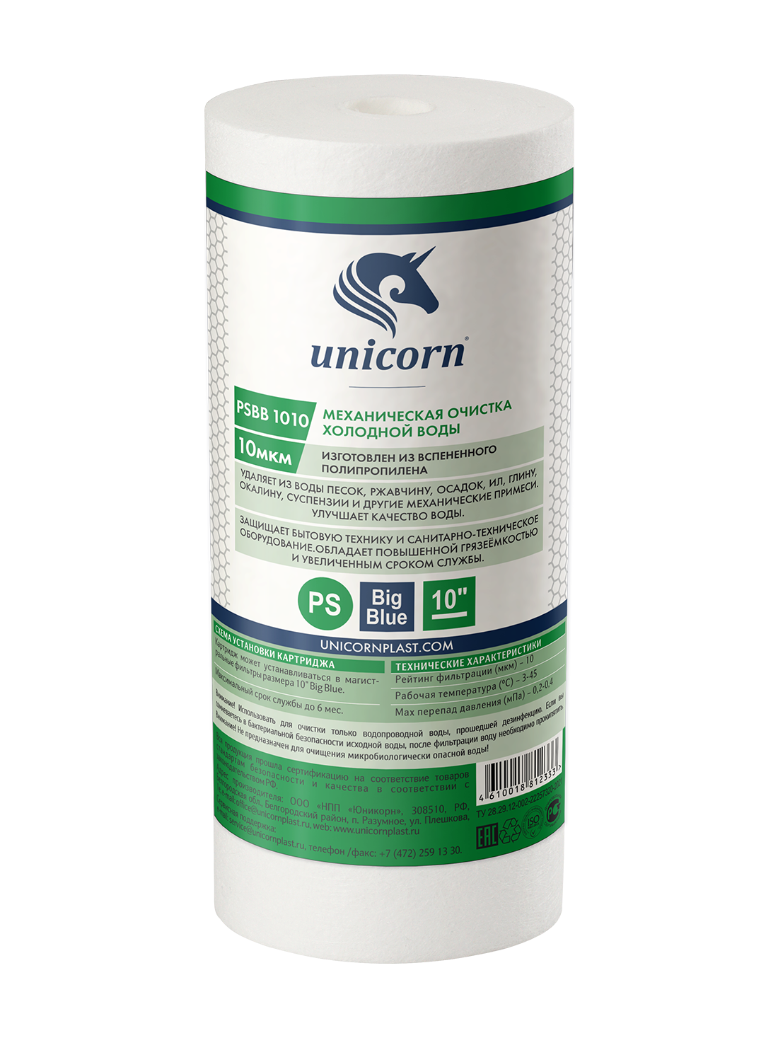 Картридж Unicorn 10BB, РS 1010 применяется для механической очистки холодной воды. Удаляет из воды песок, ржавчину, осадок, ил, глину, окалину, суспензии и другие механические примеси. Улучшает качество воды. Защищает бытовую технику и санитарно-техническое оборудование. Обладает повышенной грязеемкостью и увеличенным сроком службы.