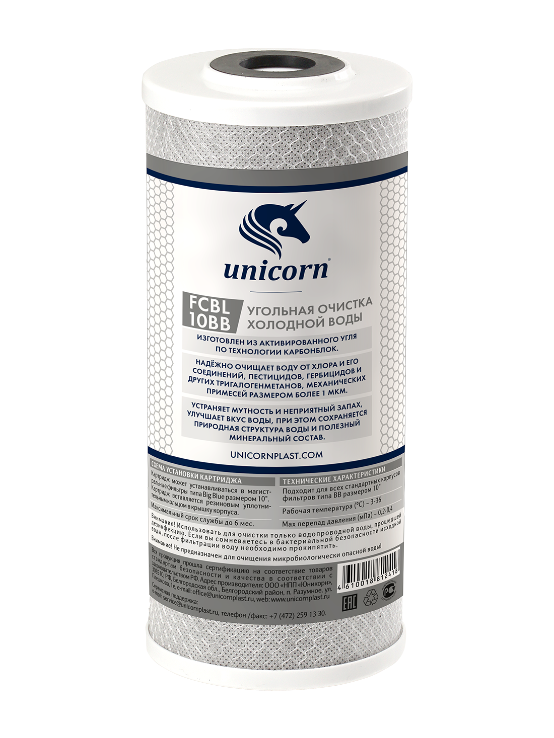 Изготовлен из активированного угля по технологии карбонблок. Надёжно очищает воду от хлора и его соединений, пестицидов, гербицидов и других тригалогенметанов, механических примесей размером более 1 мкм. Устраняет мутность и неприятный запах, улучшает вкус.