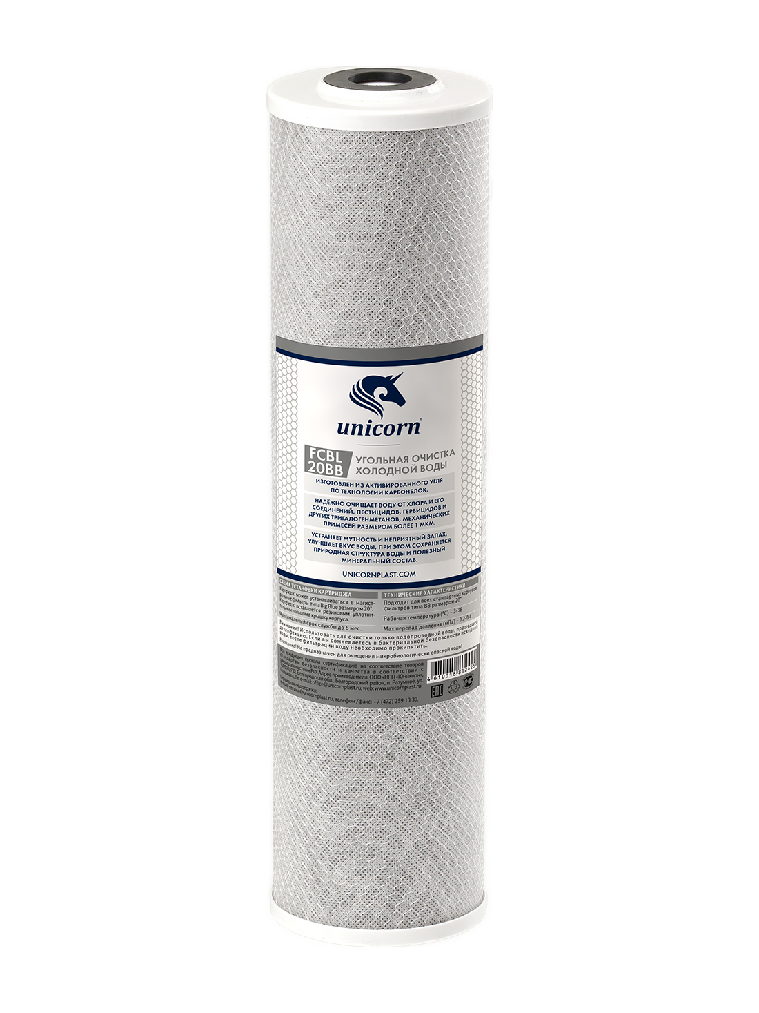 Картридж с гранулированным минеральным углем, картридж для сорбционной очистки воды от хлора, органических соединений. Разборный корпус. Производительность до 2 л/мин. Температура воды от 2 до 50 °С. Ресурс до 6 000 л.