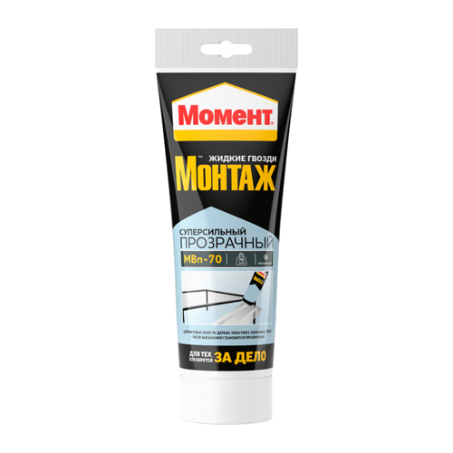 Момент Монтаж Суперсильный Прозрачный МВп-70 - монтажный клей для чистовых работ по дереву, пластику, керамике и стеклу. Первоначальная сила склеивания - 70 кг/м. Прозрачный после высыхания. Экологически чистый, без запаха. После отверждения клей возможно окрашивать. Рекомендуется для использования внутри помещения. Склеивает большинство материалов. Склеивает такие материалы как дерево, металл, ПВХ, керамику, ДСП, МДФ, гипсокартон, пробку, полистирол, пенопласт, гипс и другие подобные материалы. Используется для приклеивания: Стеновых панелей из дерева, ПВХ, пробки, гипсокартон. Изоляционных панелей, декоративных деталей, профилей. Установка подоконников и дверных рам. Приклеивания плинтусов и декоративных фризов.