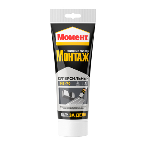 Момент Монтаж Суперсильный МВ-70 - монтажный клей с повышенной прочностью крепления. Первоначальная сила склеивания - 70 кг/м. Открытое время 15 минут. Экологически чистый, без запаха. Возможность окрашивания. Склеивает такие материалы как дерево, металл, ПВХ, керамику, ДСП, МДФ, гипсокартон, пробку, полистирол, пенопласт, гипс и другие подобные материалы. Используется для приклеивания: Стеновых панелей из дерева, ПВХ, пробки, гипсокартон. Изоляционных панелей, декоративных деталей, профилей. Установка подоконников и дверных рам. Приклеивания плинтусов и декоративных фризов.