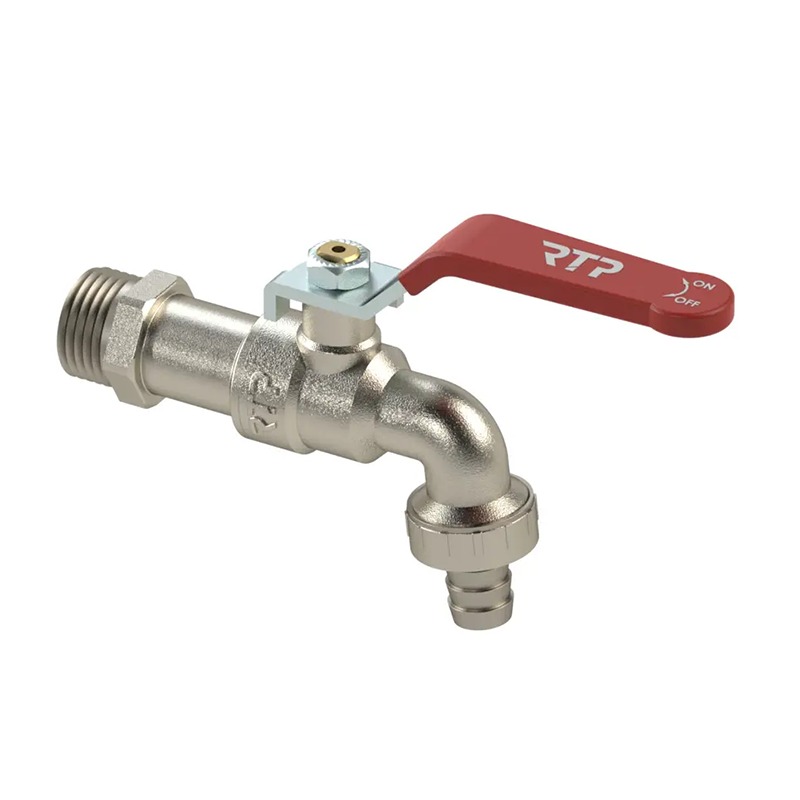 Кран шаровой водоразборный ручка рычаг, латунь, наружная/наружная резьба 1/2"х3/4"-14, индивидуальная упаковка, никель, RTP (34661)