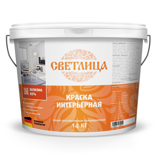Колеровка: Может колероваться колеровочными красками разных фирм. Уход за покрытием: Полный набор прочности и устойчивость к влажной уборке достигается через 2 недели. Белизна: Не менее 92%. Подготовка поверхности: Рабочая поверхность должна быть сухой и чистой. Отслаивающиеся старые покрытия должны быть удалены. Рекомендуется предварительное грунтование поверхности. Расход:140-160 г/м? при одинарном нанесении. Способ нанесения: Наносится кистью, валиком или краскопультом. Возможно нанесение на старую масляную или пентафталевую краску с предварительным грунтованием поверхности грунтовкой по старой краске нашей фирмы. Рекомендуется двукратное нанесение краски с промежуточной сушкой 1 час. Разбавитель: Вода, не более 5%. Время высыхания: До отлипа – 1 час, полное высыхание через 24 часа при температуре (20±3)°С и влажности 60%. Сухой остаток: Не менее 55%. Плотность: 1,5 г/см?. Хранение: В плотно закрытой таре при температуре от 0°С до +40°С. Срок годности 12 месяцев с даты изготовления. Не рекомендуется: окраска поверхности при температуре ниже +7°С. Технические условия: 2310-001-58311266804-2014. Более точную информацию о товаре уточняйте у операторов и консультантов торгового зала. Изображение может отличаться от представленного на витрине.