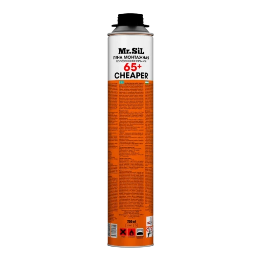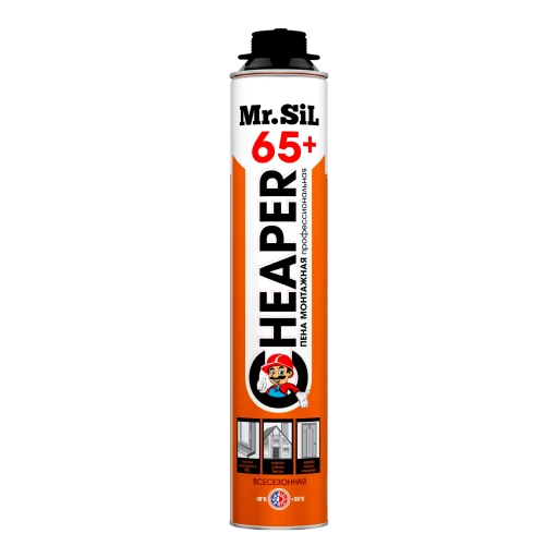 Высококачественная однокомпонентная полиуретановая монтажная пена всесезонного применения Mr.Sil CHEAPER 65+ в аэрозольной упаковке 800мл. Используется с применением специального монтажного пистолета.