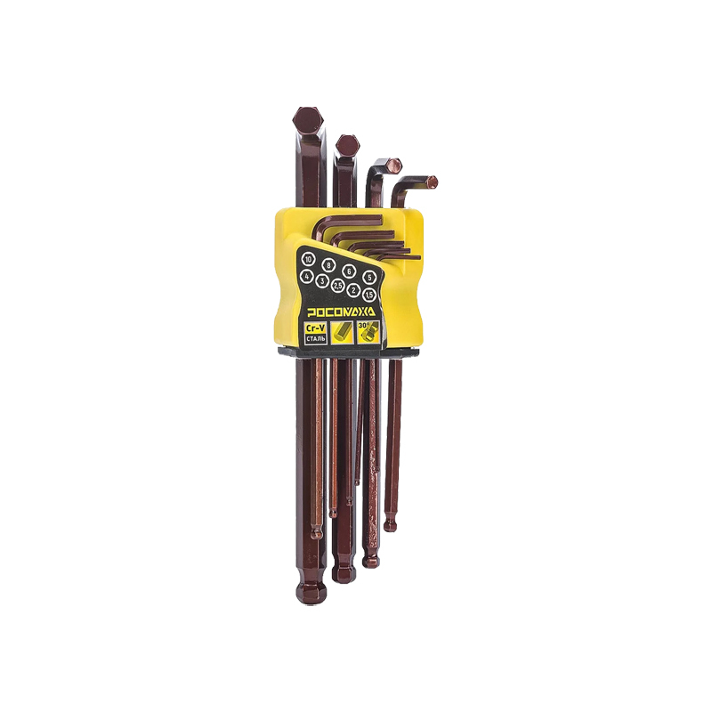 Набор угловых шестигранных ключей с шаром 9 штук (1,5; 2; 2,5; 3; 4; 5; 6; 8; 10мм) "РОСОМАХА" (900008)