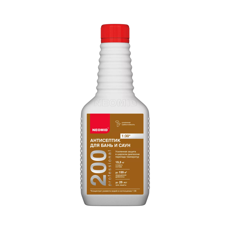 Неомид 200 1:30 и Неомид 200 1:5  новое высокоэффективное средство для усиленной защиты древесины внутри бань и саун, включая полки и скамейки. Обеспечивает сверхвысокую защиту древесины от гниения, дереворазрушающих и деревоокрашивающих плесневых грибов, в условиях частого перепада температур и повышенной влажности на срок до 25 лет.