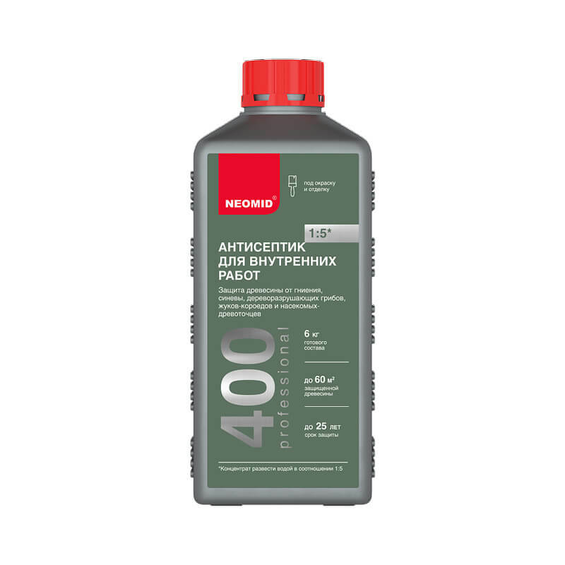 При нанесении возможно незначительное тонирование древесины, обусловленное ее сортностью и породой, а также наличием предварительной обработки. Рекомендуется произвести пробное нанесение на небольшой участок древесины. Неомид 400 – концентрат.