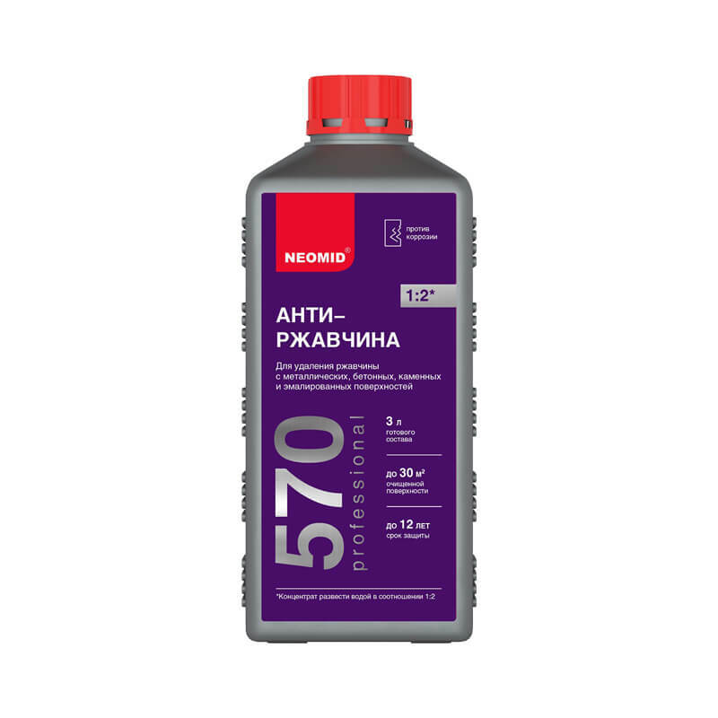 После применения NEOMID 570 на поверхности металла образуется плотная защитная пленка из нерастворимых в воде комплексных соединений, обеспечивающая высокую защиту от коррозии на срок до 12 лет, при условии последующего покрытия основания соответствующим лакокрасочным составом. Средство повышает адгезию краски к оцинкованным и другим металлическим поверхностям.