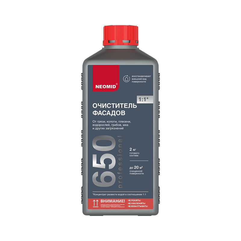При наличии на поверхности значительных загрязнений мхом, водорослями, грязью, а также отслаивающейся старой краски, произвести предварительно механическую очистку поверхности. Работы проводить при температуре воздуха и обрабатываемой поверхности от +5 до +30°С. Перед применением состав нанести в незаметном месте для определения совместимости. Состав наносить разбрызгивающим устройством, валиком или кистью с синтетическим ворсом. На окрашенных поверхностях выдержать 30-45 мин., на бетонных, кирпичных, каменных, оштукатуренных - 1 час. Смыть водой, используя моечный аппарат с давлением 40-100 бар или кисть, валик, щетку. При необходимости защиты от биопоражений рекомендуется обработать поверхность составом NEOMID BiO Ремонт.