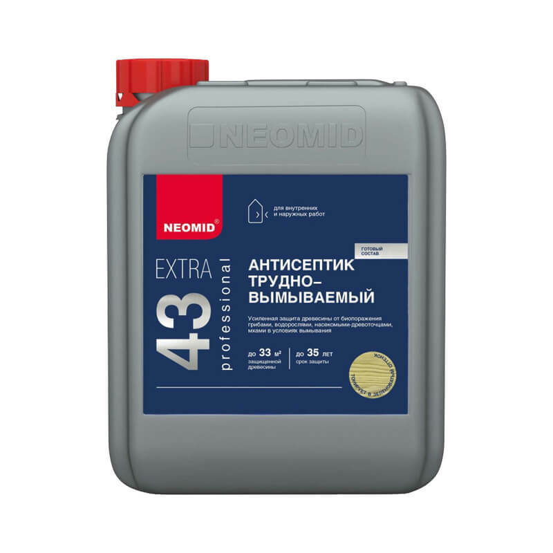 «Неомид 43 Extra, готовый раствор» – трудновымываемый антисептик для наружных и внутренних работ. Обеспечивает усиленную защиту древесины от поражения дереворазрушающими и деревоокрашивающими грибами, водорослями, мхами, а также насекомыми-древоточцами на срок до 35 лет. Может использоваться самостоятельно или как защитная пропитка перед окрашиванием деревозащитными лессирующими составами NEOMID BiO COLOR ULTRA или CLASSIC или акриловыми ЛКМ, такими как NEOMID BiO COLOR AQUA и лаками серии NEOMID на водной основе.