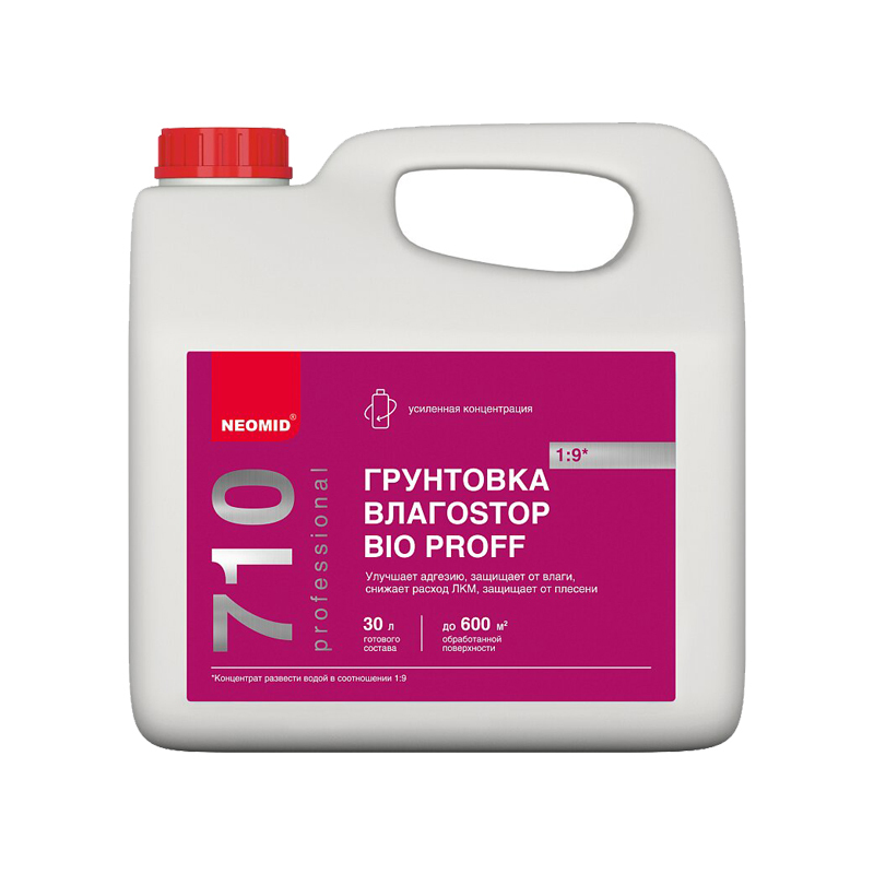 Грунт Neomid ВлагоStop Bio концентрат 1:9 /3л./ Н-Г/ВлагоProff-3/к1:9 грунт-влагоизолятор с биоцидной добавкой для наружных и внутренних работ. Предназначен для грунтования поверхностей различных материалов, в том числе чувствительных к влаге (гипсокартонные плиты, газобетон, гипсовые блоки, бетон, керамический и силикатный кирпич, камень, штукатурка, ДСП, фанера и другие материалы), с целью уменьшения пористости поверхности, выравнивания ее впитывающей способности, улучшения сцепления отделочных материалов с основой и увеличения прочности поверхностного слоя, снижения расхода ЛКМ, защиты от влаги и поражения плесневыми грибами (плесенью).