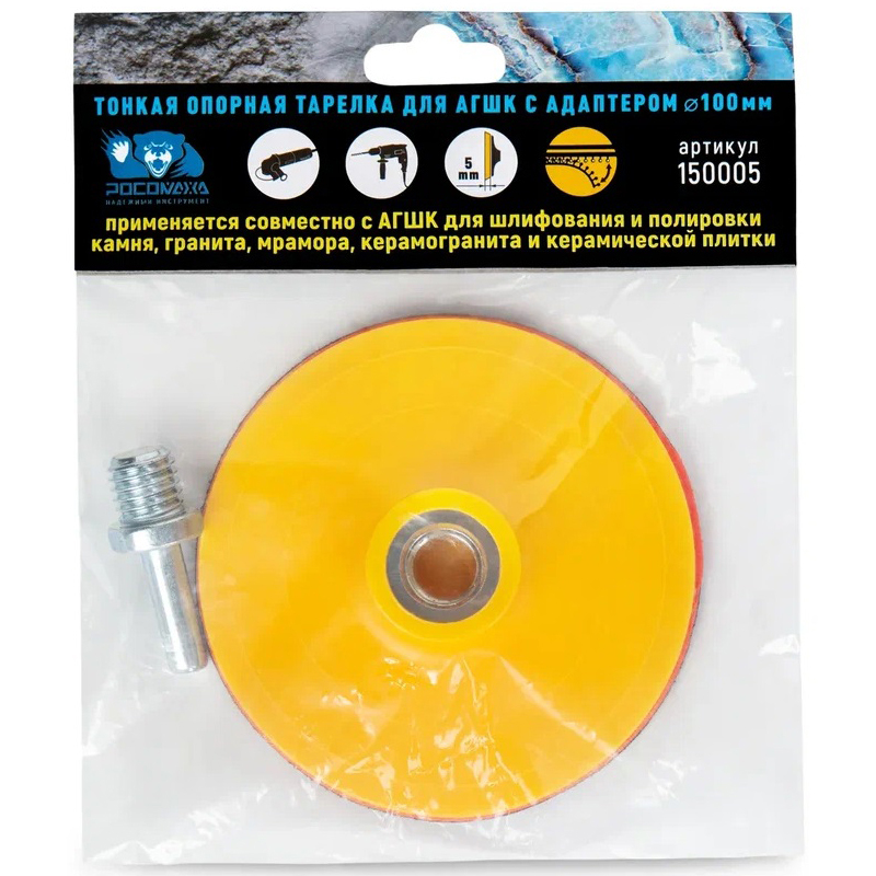 Опорная тарелка для АГШК с адаптером 100 мм росомаха 150010. Применяется для шлифования и полировки камня, гранита, мрамора, керамогранита и керамической плитки.