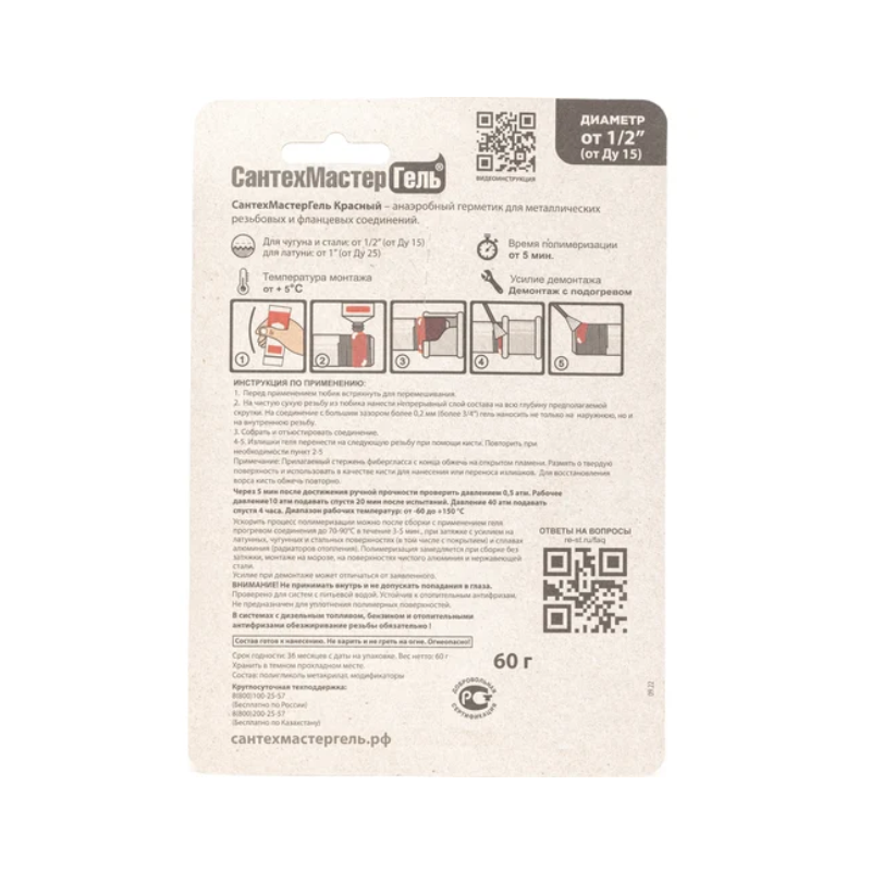 Этот гель отлично подходит для сверхпрочной фиксации и герметизации резьбы и фитингов в трубопроводах, собранных с использованием черных металлов. Применяется для соединений диаметром от 1,5"