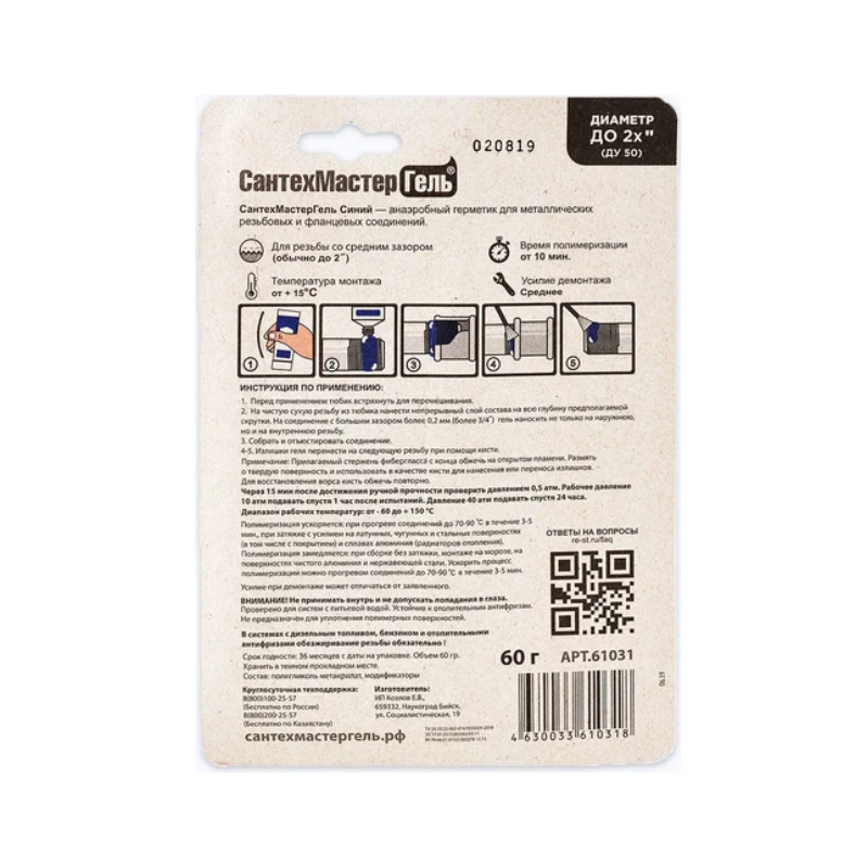 Данный состав рекомендован к использованию для герметизации металлических резьб, фитингов и фланцев. Используется для соединений диаметром до 2". Соединение, собранное на данный гель поддается демонтажу с использованием инструмента.